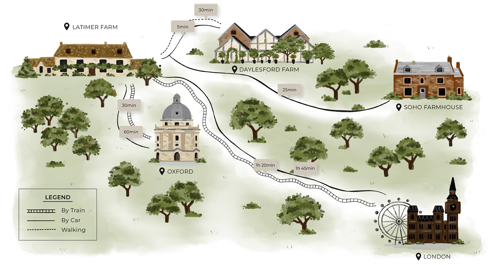 Just 1 hour 20 minutes by train from London Paddington to Kingham station, followed by a short 10 minute drive, it is both secluded and well connected. By car, London is approximately 1 hour 45 minutes away.